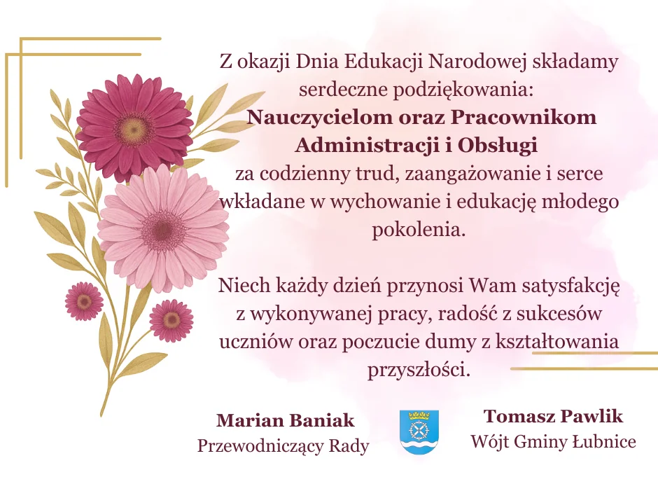 Z okazji Dnia Edukacji Narodowej składamy serdeczne podziękowania: Nauczycielom oraz Pracownikom Administracji i Obsługi za codzienny trud, zaangażowanie i serce wkładane w wychowanie i edukację młodego pokolenia. Niech każdy dzień przynosi Wam satysfakcję z wykonywanej pracy, radość z sukcesów uczniów oraz poczucie dumy z kształtowania przyszłości.